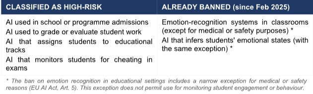 The EU AI Act (Regulation (EU) 2024/1689) classifies four categories of educational AI as HIGH-RISK, meaning they face strict legal obligations rather than outright bans: