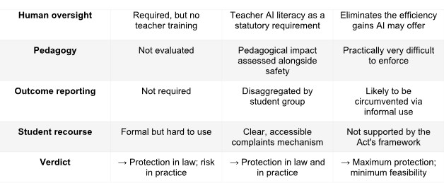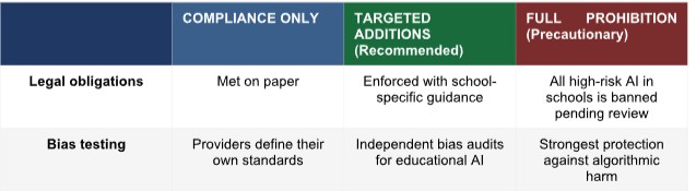 Policy-makers face a genuine choice: not whether to implement the Act, but how much further to go. Three approaches are available. Only one protects students in practice, not just on paper.