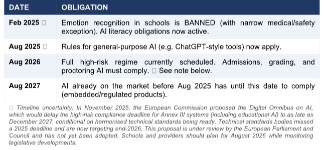 High-risk classification means providers and schools must meet demanding requirements: ongoing risk management; bias testing in training data; technical documentation; operation logs for audit; and, critically, human oversight that allows qualified staff to review and override AI outputs. The obligations take effect on a phased timeline: