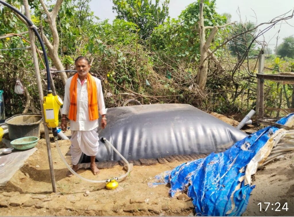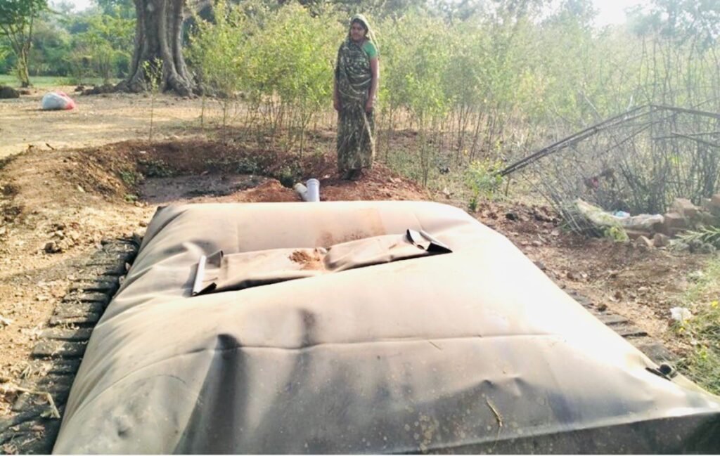 Sarita Rakesh Damor from Maskamohdi village uses about fifteen kilograms of dung and ten litres of water daily, generating enough gas for her household’s cooking needs. This has eliminated the need for regular LPG refills.