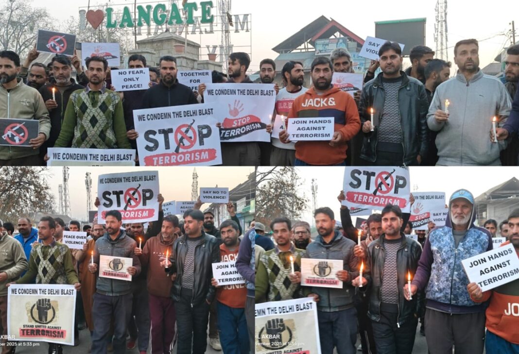 Similarly, a candlelight march was also organized at Main Chowk Langate Kupwara, where members of civil society, local traders, and residents gathered in large numbers to denounce the Delhi car blast.