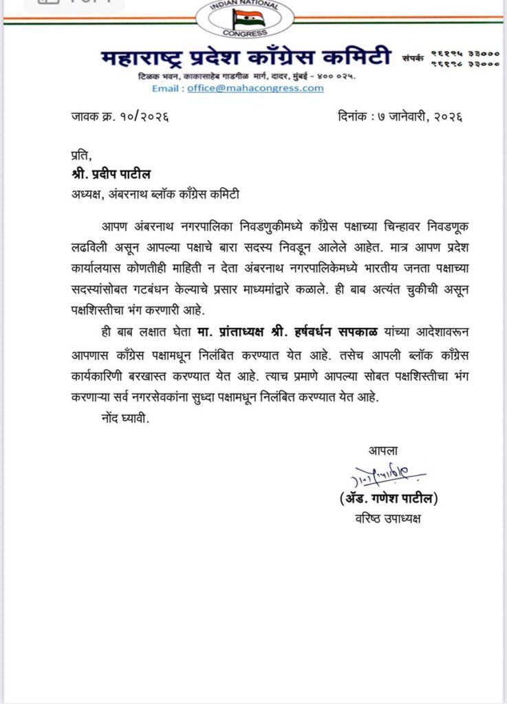 The Maharashtra Pradesh Congress Committee (MPCC) has suspended Pradeep Patil, the Ambernath block president of the Congress, along with other local office-bearers and corporators. The party has also dissolved the Ambernath Congress block committee with immediate effect.