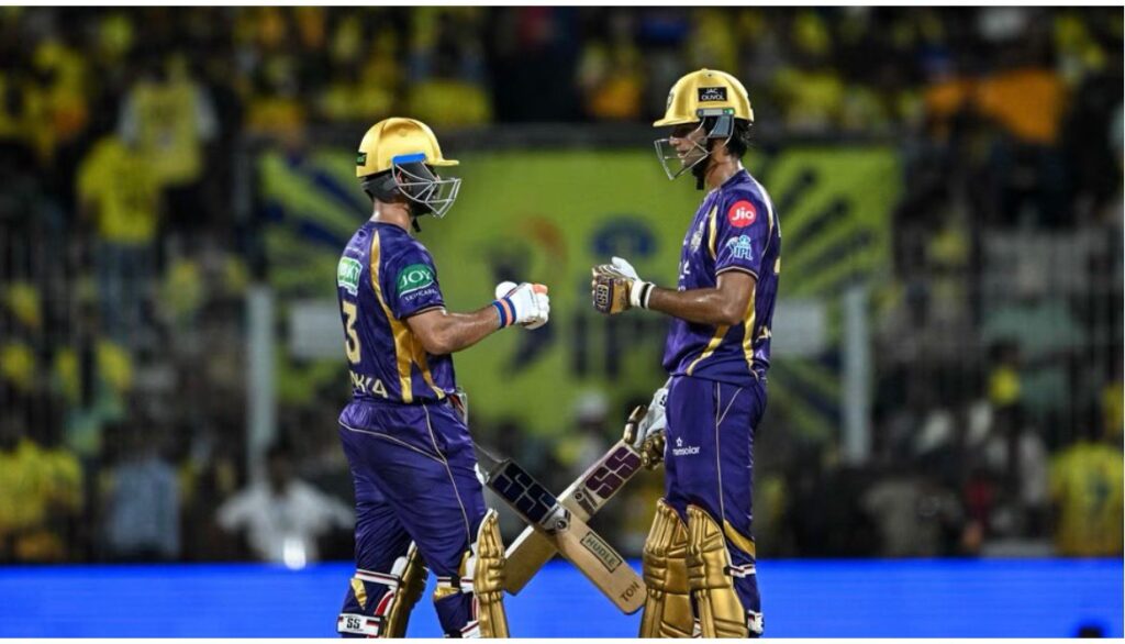 Chennai’s bowlers struck early. Finn Allen fell in the second over to Anshul Kamboj, who used movement and discipline effectively. Khaleel Ahmed challenged Sunil Narine with angles and variations before eventually dismissing him.