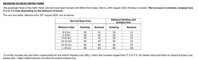 According to DMRC, the new fare structure, effective from August 25, 2025, has been introduced to balance rising operational costs while keeping the journey affordable for daily commuters. The revised slabs will apply uniformly across all lines of the Delhi Metro, with minor adjustments made to ensure minimal impact on passengers.