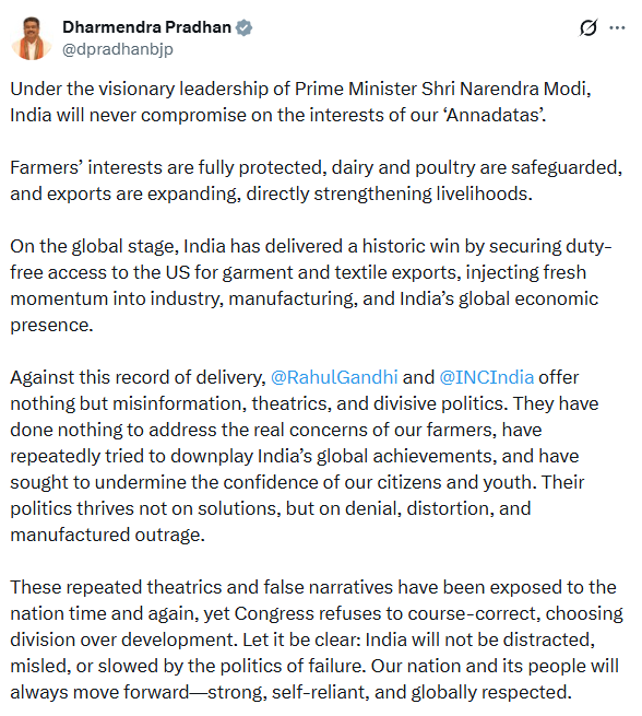 He wrote: “Under the visionary leadership of Prime Minister Shri Narendra Modi, India will never compromise on the interests of our ‘Annadatas’. Farmers’ interests are fully protected, dairy and poultry are safeguarded, and exports are expanding, directly strengthening livelihoods. On the global stage, India has delivered a historic win by securing duty-free access to the US for garment and textile exports, injecting fresh momentum into industry, manufacturing, and India’s global economic presence. Against this record of delivery, Rahul Gandhi and INC India offer nothing but misinformation, theatrics, and divisive politics. They have done nothing to address the real concerns of our farmers, have repeatedly tried to downplay India’s global achievements, and have sought to undermine the confidence of our citizens and youth. Their politics thrives not on solutions, but on denial, distortion, and manufactured outrage. These repeated theatrics and false narratives have been exposed to the nation time and again, yet Congress refuses to course-correct, choosing division over development. Let it be clear: India will not be distracted, misled, or slowed by the politics of failure. Our nation and its people will always move forward—strong, self-reliant, and globally respected.”