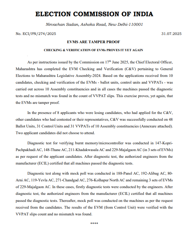 Mumbai: The Election Commission of India (ECI) has reaffirmed the integrity of Electronic Voting Machines (EVMs), following a thorough checking and verification process conducted in Maharashtra. The exercise was carried out in compliance with the Commission’s directive dated 17th June 2025, in response to applications submitted by 10 candidates who contested the 2024 Maharashtra Legislative Assembly Elections.
