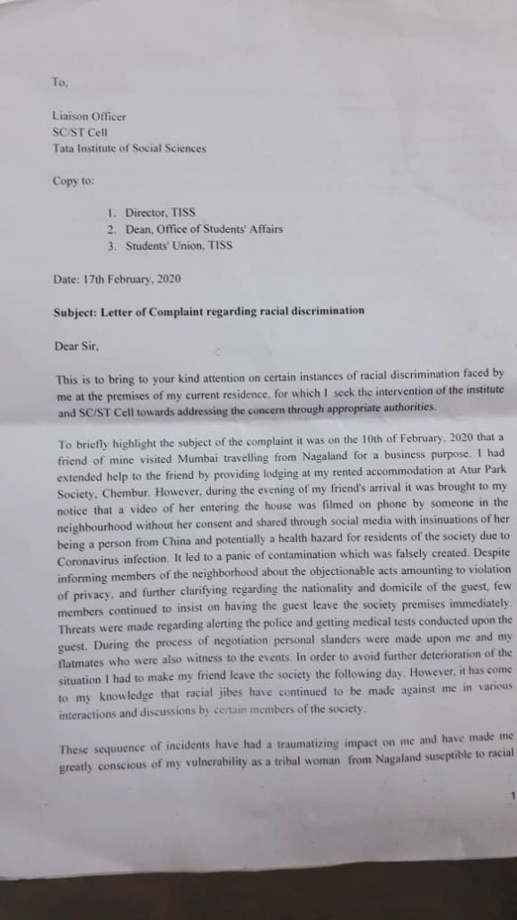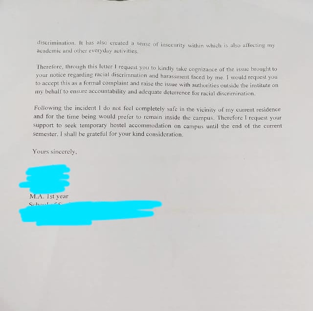 “These sequence of incidents have had a traumatizing impact on me and made me greatly conscious of my vulnerability as a tribal woman from Nagaland susceptible to racial discrimination. It has also created a sense of insecurity within, which is also affecting my academic and other everyday activities,” the student wrote.