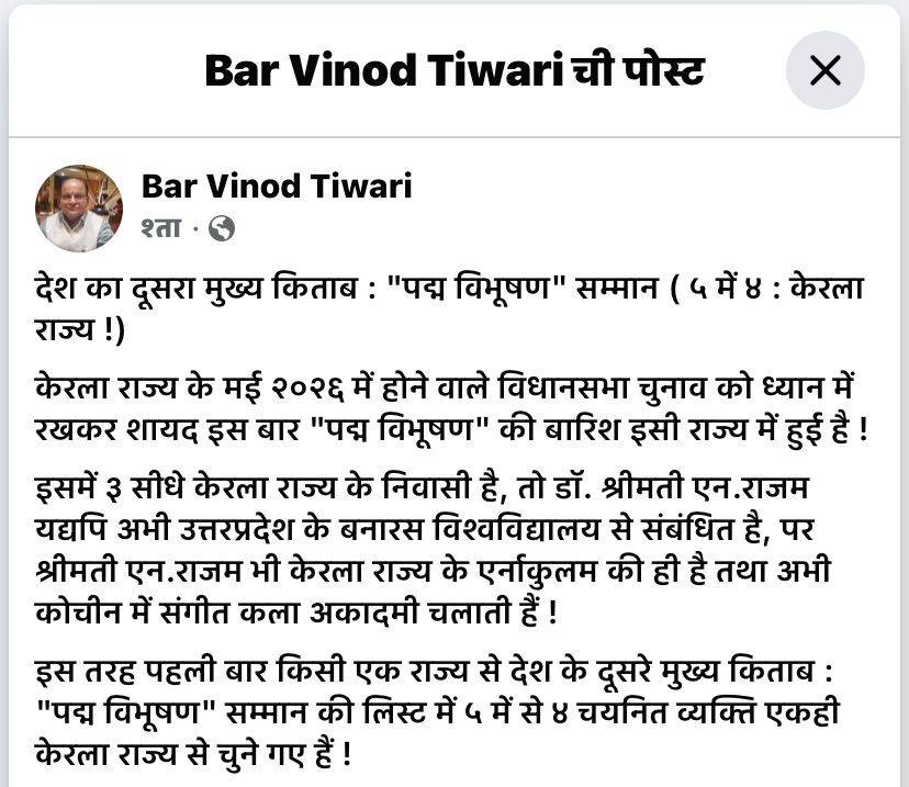 In effect, four out of five Padma Vibhushan awardees have deep roots in Kerala, an extraordinary concentration that coincides with a politically sensitive moment for the state.