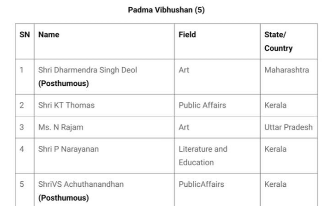 Among the Padma Vibhushan recipients are former Kerala Chief Minister V.S. Achuthanandan, honoured posthumously, along with Justice K.T. Thomas and P. Narayanan, both long associated with Kerala’s intellectual and social landscape. The fourth recipient, Dr. N. Rajam, though currently linked to Banaras Hindu University, is originally from Ernakulam, Kerala, and continues to actively run a music academy in Kochi—further strengthening the state’s presence on the elite list.