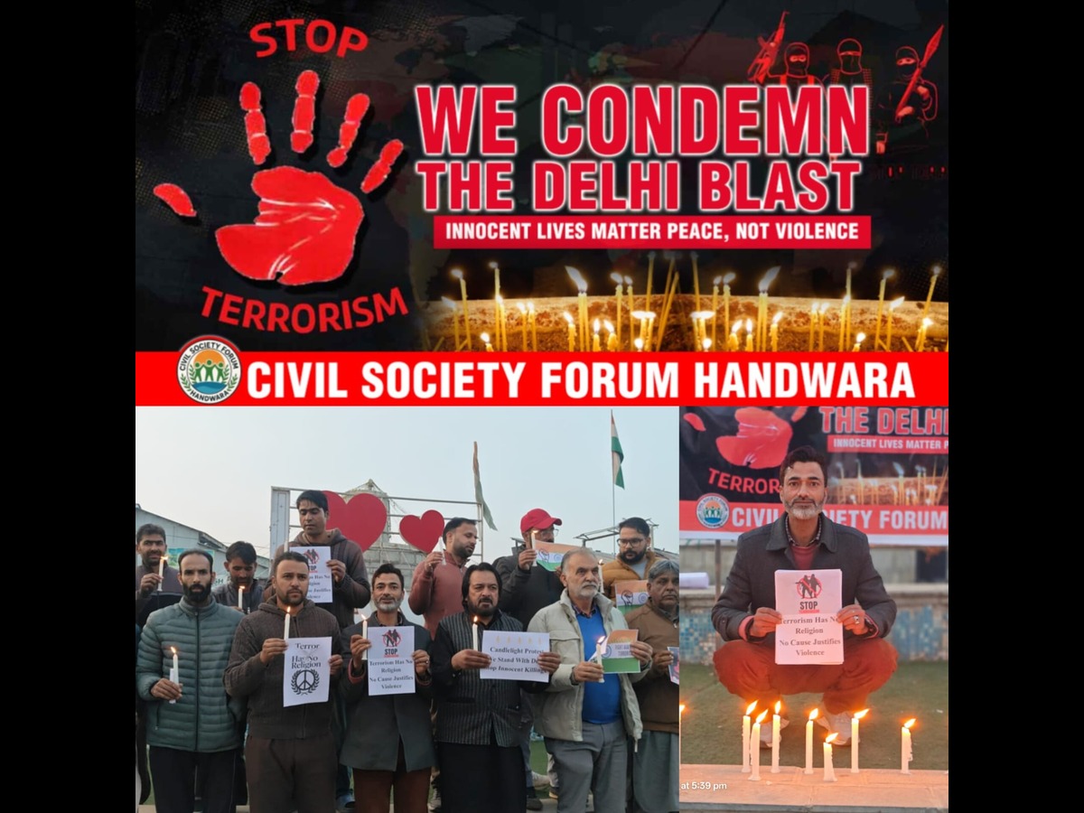 Kupwara: In a powerful show of solidarity, the Civil Society Forum Handwara organized a candlelight protest at the Historic Main Chowk Handwara to denounce the barbaric twin bomb blasts in Delhi. Members of various social, trade, and community organizations participated in the peaceful demonstration, expressing deep sorrow and outrage over the tragic incident.