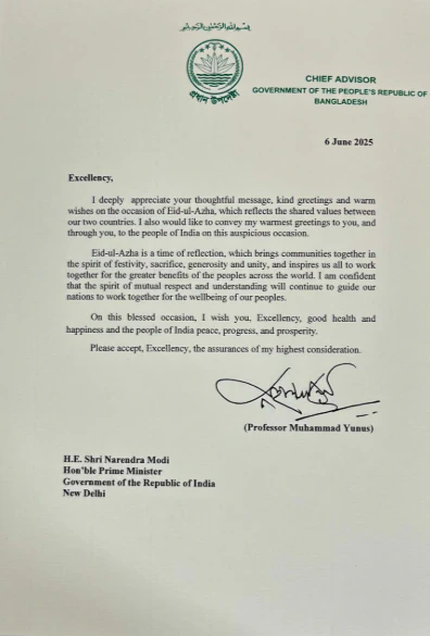Bangladesh’s interim Chief Adviser Muhammad Yunus, in a letter addressed to Prime Minister Narendra Modi, expressed gratitude for his Eid-ul-Adha wishes and highlighted the enduring friendship between the two nations.
