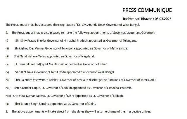 Following his resignation, R. N. Ravi, who was serving as Governor of Tamil Nadu, has been appointed as the new Governor of West Bengal.