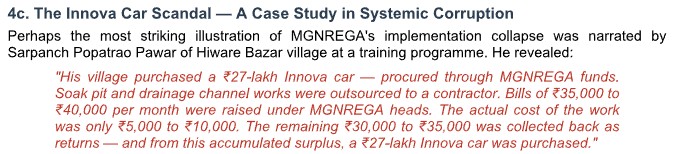 One example, narrated publicly by a village leader, illustrates the scale of distortion. In Hiware Bazar, funds under the scheme were used in a manner that led to the purchase of a ₹27 lakh vehicle. Works were shown under official records, bills were raised, and excess funds were siphoned off. What should have generated employment ended up financing assets unrelated to labour welfare. This is not an isolated case. It is a reflection of how a rights-based scheme can be hollowed out by weak implementation.