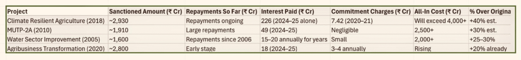 ProjectSanctioned Amount (₹ Cr)Repayments So Far (₹ Cr)Interest Paid (₹ Cr)Commitment Charges (₹ Cr)All-In Cost (₹ Cr)% Over Original
