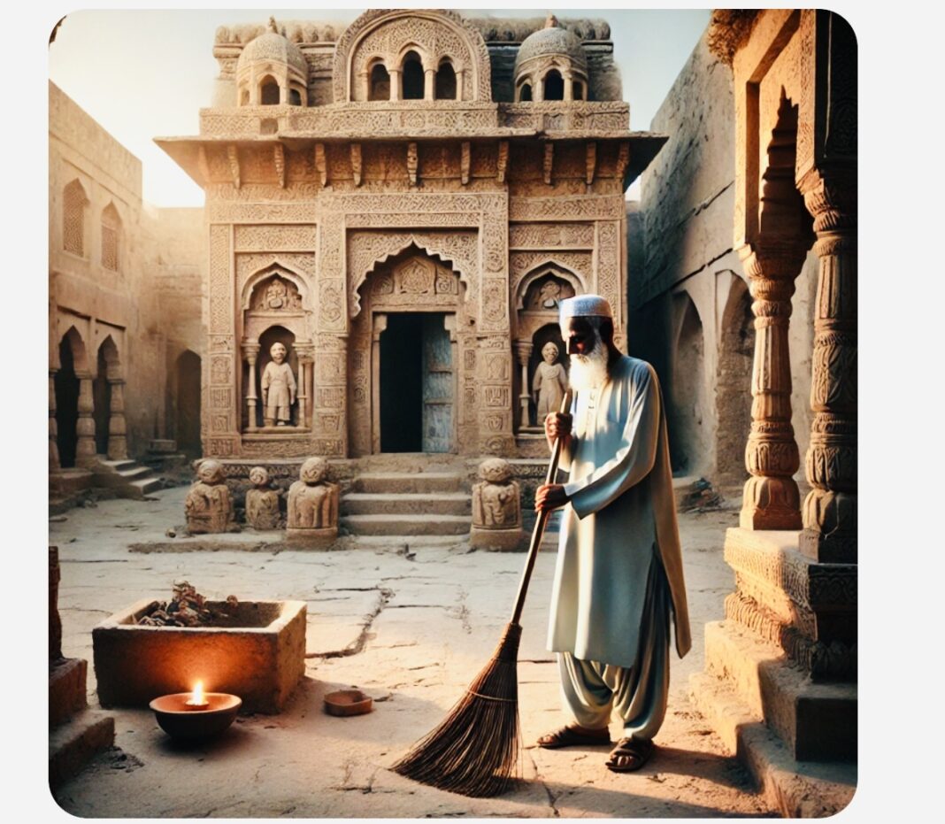 His name is Ghulam Nabi, a 65-year-old Muslim who has spent the last four decades caring for this temple as if it were his own home. Armed with a broom and a bucket of water, he sweeps the courtyard, washes the stone idols, and lights a small clay lamp. “It’s my duty,” he says simply. “A place of worship, no matter whose, should never be abandoned.”
