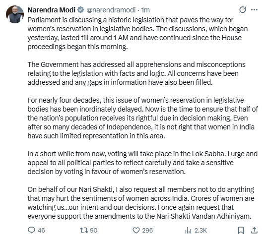In his appeal, PM Modi said that despite decades of independence, women still remain underrepresented in legislative institutions and that the delay in providing reservation had continued for political reasons.