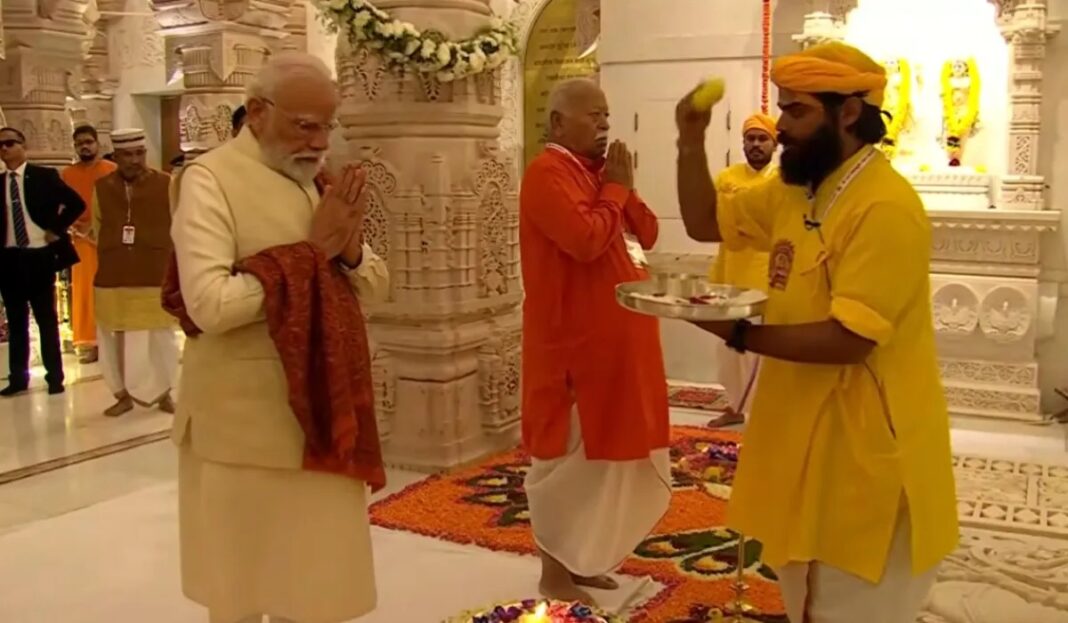 PM Modi later offered Darshan and Pooja at the Ram Darbar Garbh Grah and the Ram Lalla Garbha Grah, where rituals were performed by temple priests. Shortly after noon, he ascended to the temple’s upper structure and ceremonially unfurled a 10×20-foot saffron flag atop the Shikhar. The flag, featuring symbols representing the ideals of Ram Rajya and the virtues of Bhagwan Shri Ram, was raised amid chants of “Jai Shri Ram” echoing across Ayodhya.