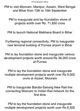 New Delhi: Prime Minister Narendra Modi is set to embark on a three-day tour from 13th to 15th September, visiting Mizoram, Manipur, Assam, West Bengal, and Bihar.