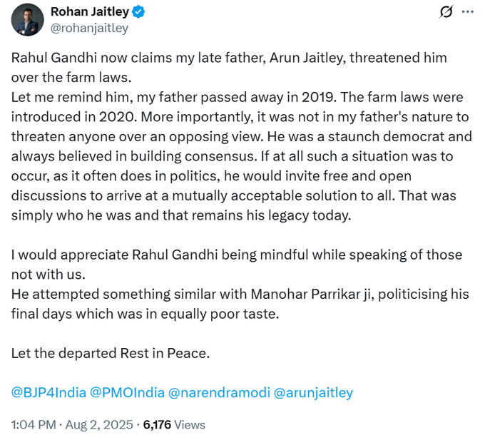 Reacting sharply, Rohan Jaitley, son of Arun Jaitley, called Rahul Gandhi’s claim not just inaccurate but impossible. He said, “Rahul Gandhi now claims my late father, Arun Jaitley, threatened him over the farm laws. Let me remind him, my father passed away in 2019. The farm laws were introduced in 2020.”