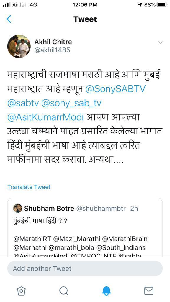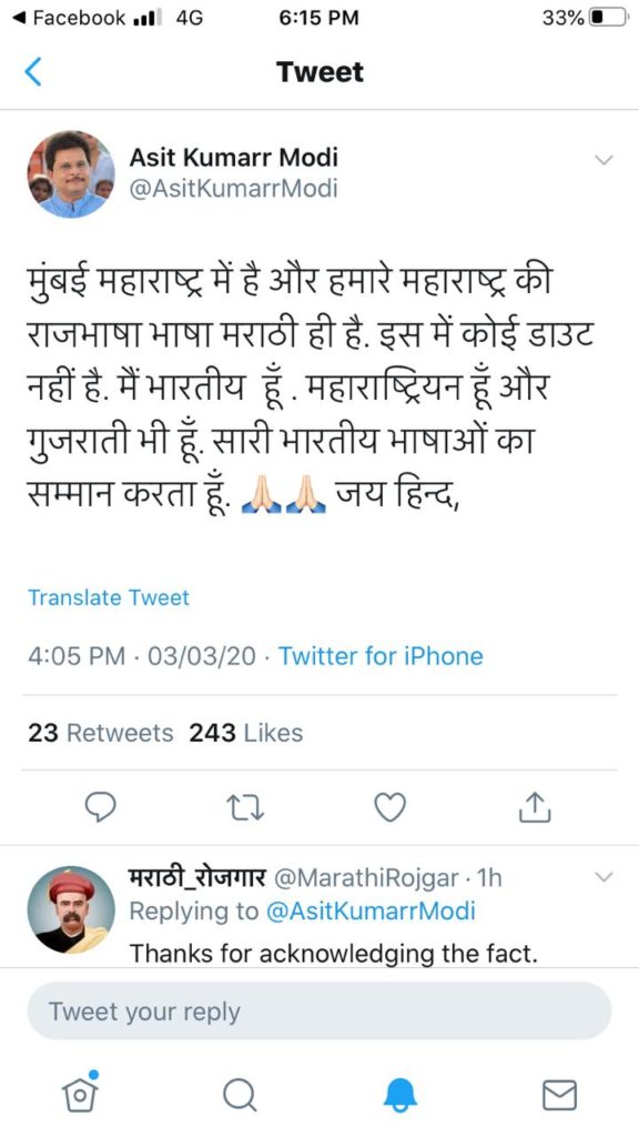 However, Now, Asit Kumarr Modi, the creator of Taarak Mehta Ka Ooltah Chashmah, has issued a statement on Twitter. He wrote, “Mumbai Maharashtra mein hai aur humare Maharashtra ki rajbhasha Marathi hi hai. Isme koi doubt nahi hai. Main bharatiya hoon. Maharashtrian hoon aur Gujarati bhi. Saari bharatiya bhashaon ka samman karta hoon (Mumbai is in Maharashtra and Marathi is the official language of our Maharashtra. There is no doubt about that. I am an Indian. I am a Maharashtrian and also a Gujarati. I respect all Indian languages). Jai Hind.”