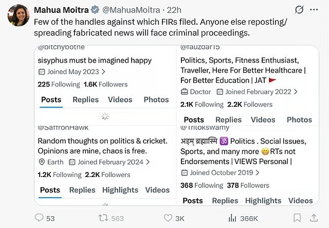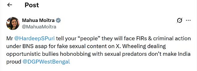 In another post, Moitra shared screenshots of some of the social media handles against which complaints have been filed, reiterating that police action would follow against every account involved in spreading the material. When asked to comment further on the issue, she responded that the matter is now with the police and that she does not intend to offer any remarks beyond the legal process.