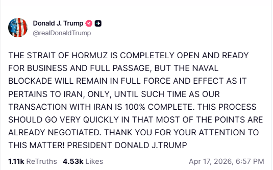 US President Donald Trump announced that the Strait of Hormuz is now fully open for commercial passage, but confirmed that the naval blockade on Iran will continue until Washington’s ongoing negotiations with Tehran are “100% complete.”